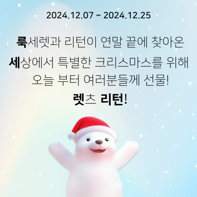 올해 마지막 연휴 크리스마스! 리턴과 룩세렛이 함께 유저분들의 특별하고 재미있는 시간을 위해 준비했습니다. 준비된 선물 뽑기에 참여하고, 멋진 상품도 받아가세요!